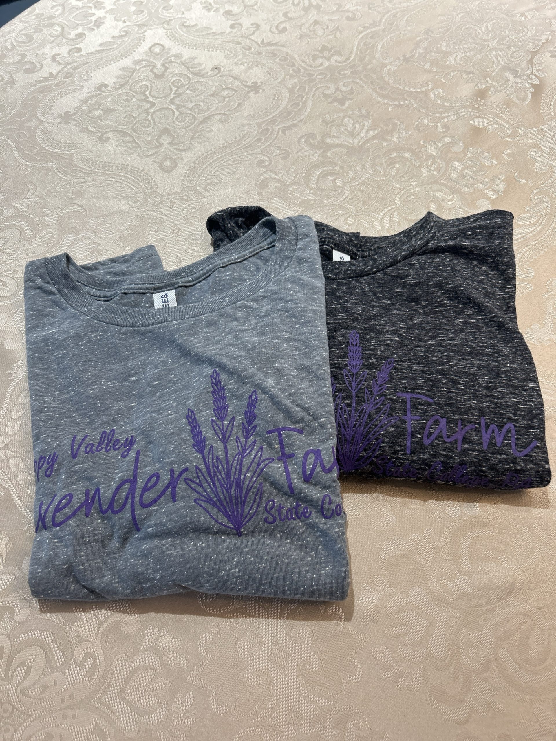 Beautiful soft t-shirt, pre-shrunk, runs a little large. Poly/cotton blend, stretchy feel and lightweight. Light gray speckled color available in Small, Medium, Large, XL. Black speckled color available in Large and XL only.